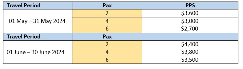RATES ARE PER PERSON IN USD BASED ON GROUP SIZE